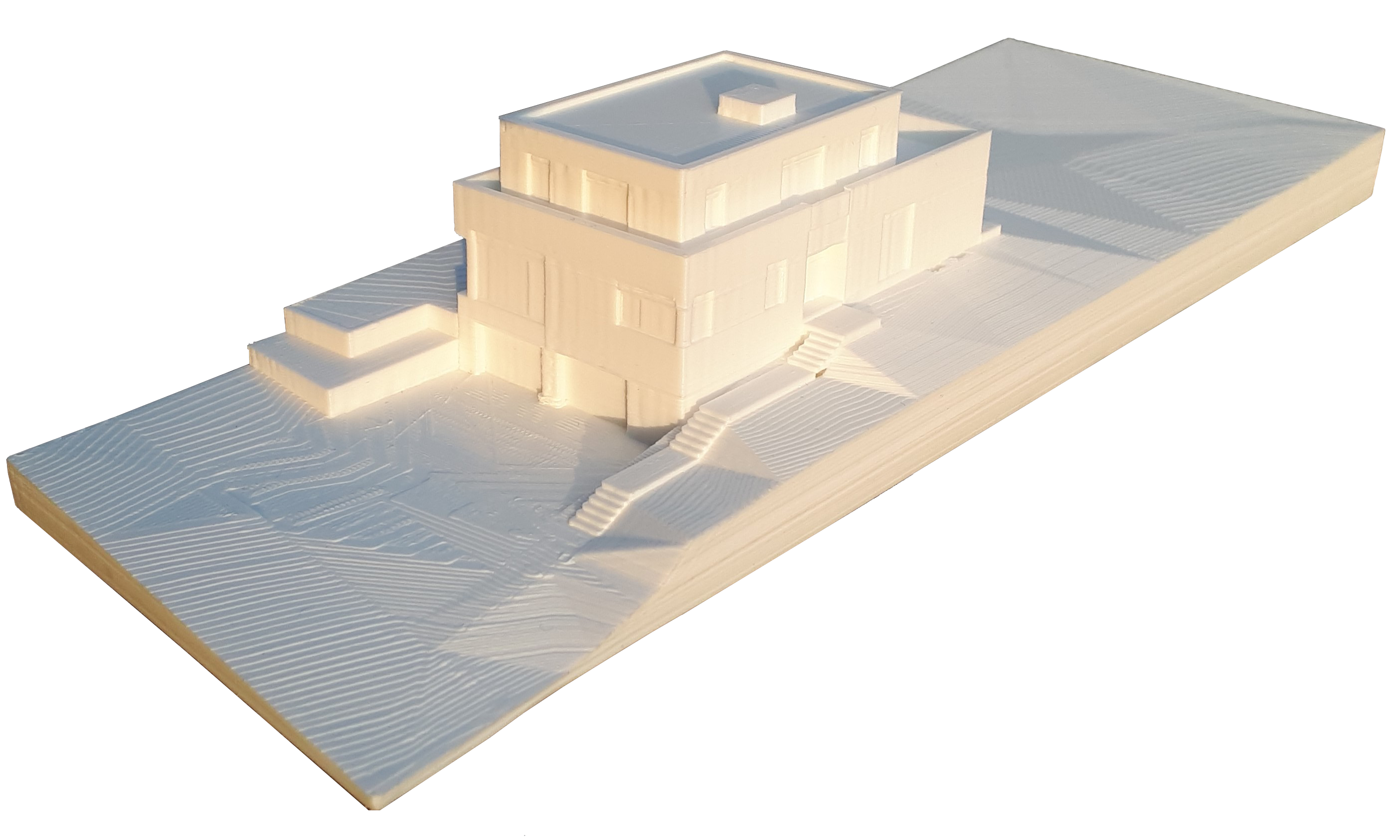 Maquette d'une maison individuel avec déformation visible de la parcelle de terrain, à l'échelle 1/200ème.